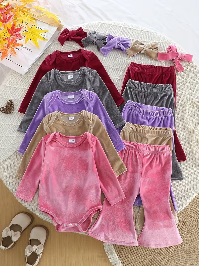 This coordinated five-set bundle provides essential pieces designed for stylish everyday wear, featuring matching headscarves, long-sleeve jumpsuits, and flared trousers for baby girls.
